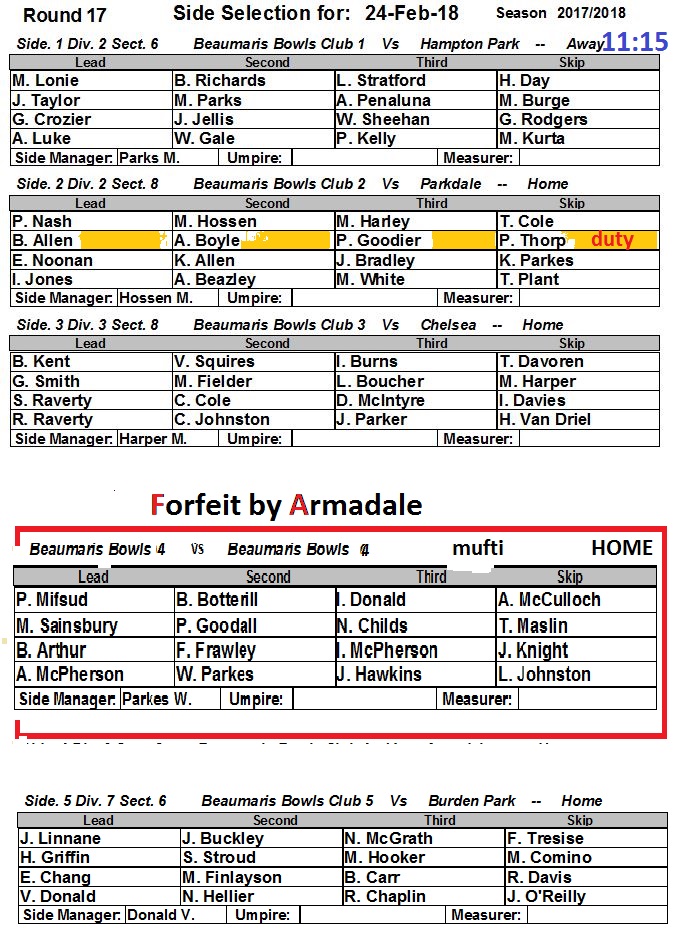 Pennant Selection – Saturday February 15, 2018 · Beaumaris Bowls Club · Pennant Selections - Saturday · No Comments